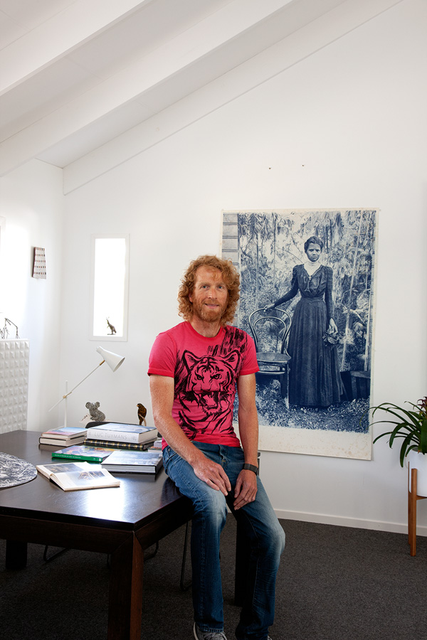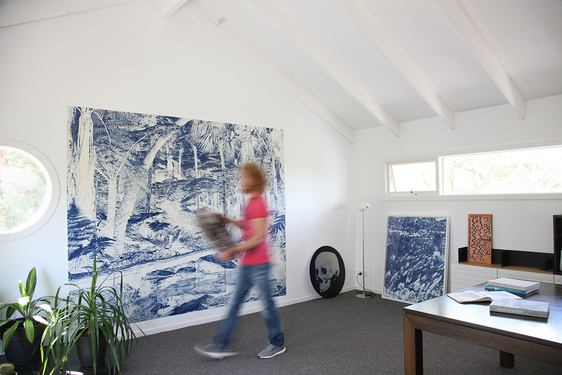 Danie’s home sits tucked into the side of Mount Gibraltar and doubles as his studio. Its 1950s open-plan design is awash with his and Joanne’s sculpture and mixed media works. These include prints, drawings and tableaux created in Danie’s trademark blue and white willow engraving technique, the practice that first garnered him national and international attention. Multi layered, some intricately drawn from photographs, the patterning seeks to denote Josiah Spode’s tableware that travelled the world with its British colonialising owners in the 18th and 19th centuries. Although Danie’s practice has moved on from those days, this work remains sought after by collectors.