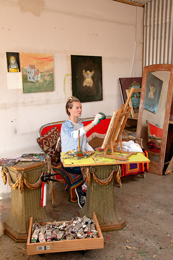“I get up at 6am to have some time by myself, then I’m in my studio by 9am,” says Vanessa, who paints in oil or acrylic directly on board or canvas. “When I’m there I can focus. I hate anyone else coming in. We tag team with Isobel on the weekends. Will’s against the idea of me working too much but it keeps me sane. There are only so many Wiggles songs I can take.”